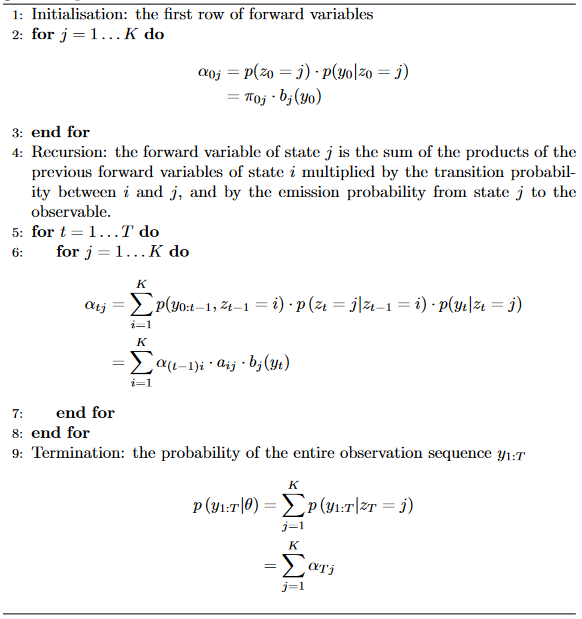 The algorithm works by calculating the components of a \([T \times K]\) matrix \(\alpha\) of forward variables defined by: