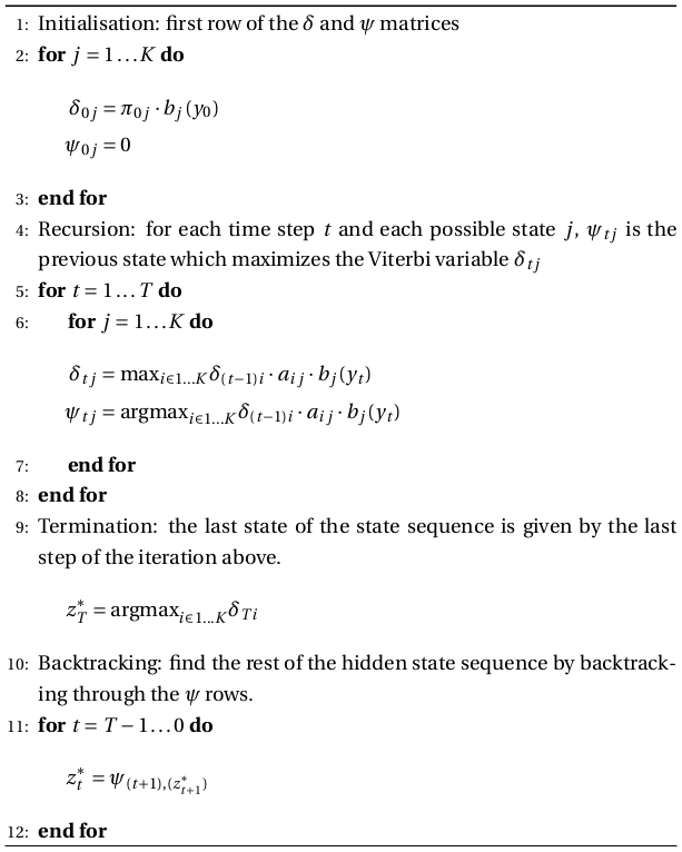 Now that the parameters of the HMM have been estimated, we can decode it, i.e. estimating the most likely state sequence. This is done by the Viterbi algorithm below.