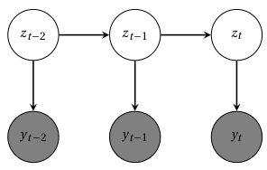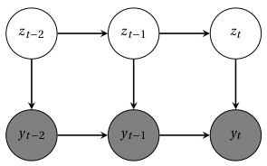 In a hidden Markov model (HMM), the sequence of \(T\) output variables \({y_t}\) is generated by a parallel sequence of latent categorical state variables \(z_t \in \left\{ 1,\cdots , K\right\}\). These hidden states are a Markov chain, so that \(z_t\) is conditionally independent of other variables given \(z_{t-1}\).