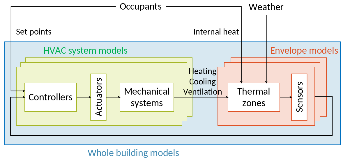 Whole building models take weather files and occupancy information (set points, schedules, internal heat gain) as input. These models range from very simplified (energy signature models) to detailed BES. The dependent variable can be energy consumption recorded by meters, or heating and cooling loads if such measurements are available.