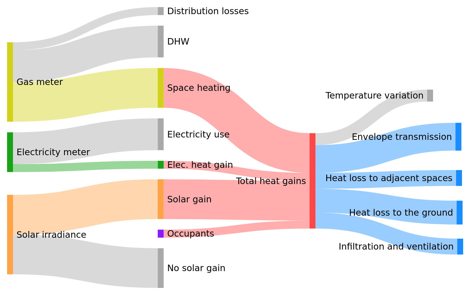 Since we will give our building energy models a probabilistic formulation, these models should stay as simple as possible, while staying close to the main phenomena that govern the heat and energy balance of an observed building. A schematic outlook of heat gains and losses in a heated space is shown on Fig. 14 on the example of a heated building in which gas is the main fuel used by the heating appliances. A similar reasoning can be done in other conditions, such as an air conditioned building in summer.