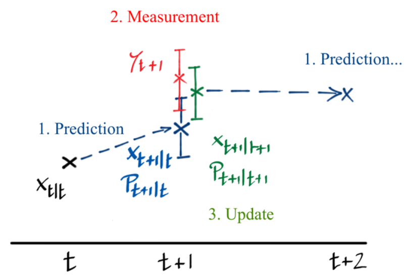 Updating step: the new states at time \(t+1\) are updated, as a compromise between the one-step ahead prediction and the measurement.