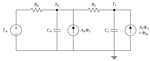 where \(T_i\), \(T_e\) and \(T_o\) are the indoor, envelope and outdoor temperatures. The envelope temperature is associated with the thermal mass of the opaque surfaces, and does not represent a specific coordinate within the envelope. The model has two states \(T_e\) (unobserved) and \(T_i\) (observed); \(\Phi_h\) (W) is the indoor heating power; \(\Phi_s\) (W/m\(^2\)) is the global horizontal solar irradiance. \(R_i\) (K/W) is the thermal resistance between the indoor air temperature and the envelope, \(R_e\) the resistance between the envelope and the ambient air. \(C_i\) and \(C_e\) (J/K) are the heat capacitances of the interior and the envelope, respectively, and \(A_i\) and \(A_e\) (m\(^2\)) are their solar gain coefficients. \(\{\omega_i\}\) and \(\{\omega_e\}\) are standard Wiener processes and \(\sigma_i^2\) are \(\sigma_e^2\) are their variances. This process noise is a way to account for modelling approximations, unrecognized inputs or noise-corrupted input measurements.