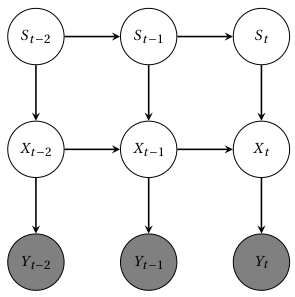 One of the forms of SSSMs is shown here, where the continuous state variable \(X\) is conditioned on a categorical latent variable \(S\) denoted the switch. Like in an HMM or MSM, the switch refers to one of several possible regimes the system can be in. The solutions of such models with a fixed number of modes of operation can be approximated by several methods